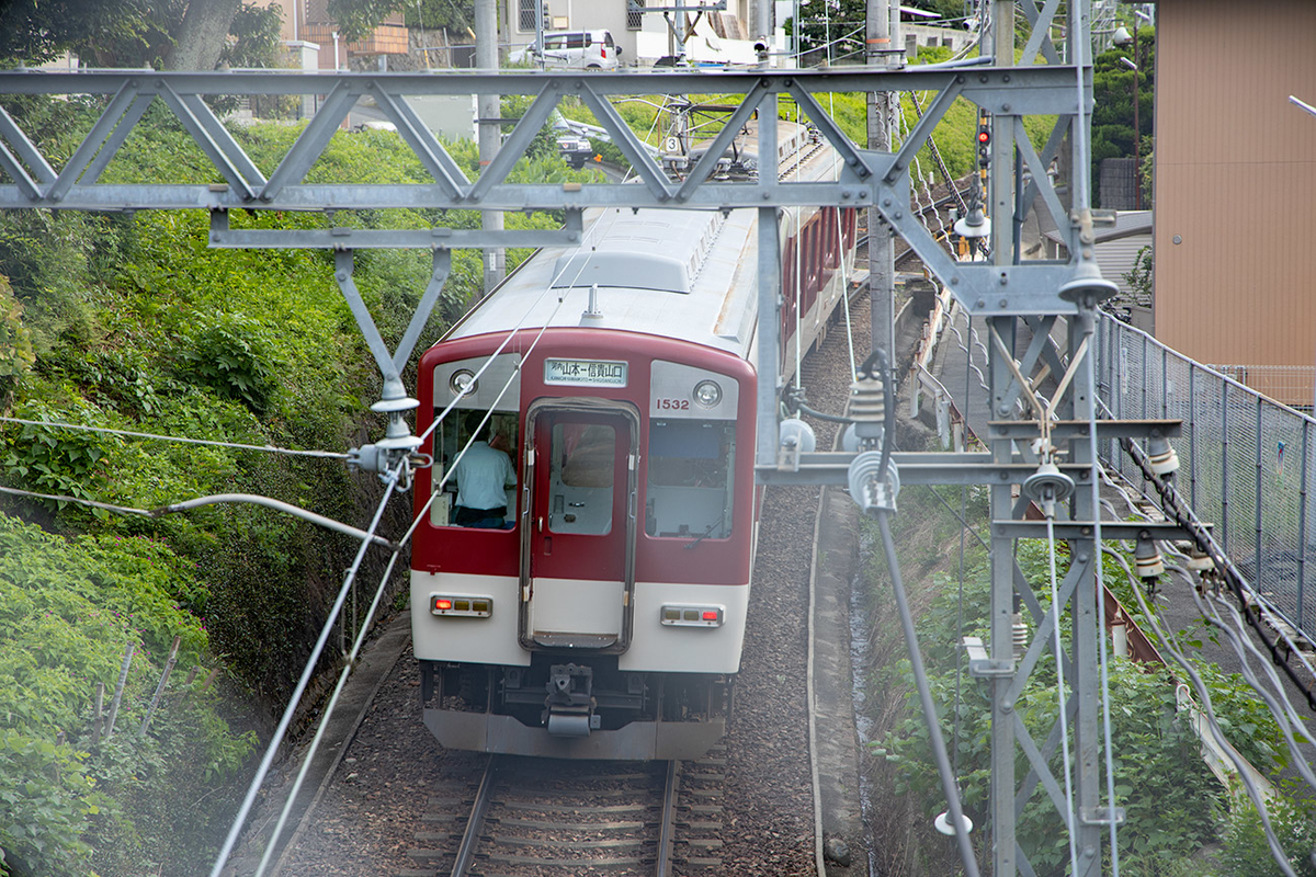 フェンス越しに橋の下を通る近鉄電車の車両を撮影。