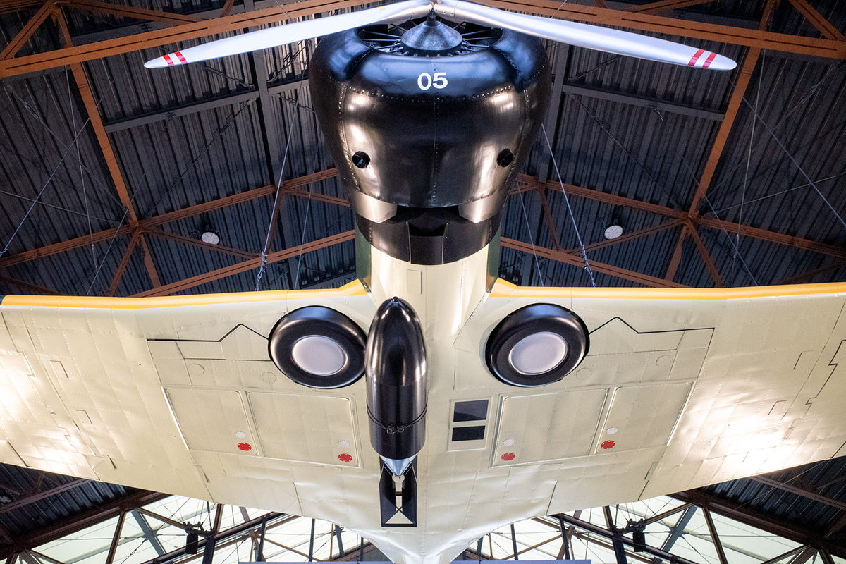 そして天井から吊り下げられているのが九七式艦上攻撃機の実物大模型。